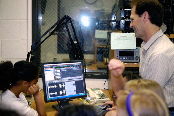 Admissions representative Benjamin Z. Mayer jokes with youngsters upon their arrival outside Klump Academic Center Students point to images of their classmates in the adjoining studio as Bruce E. Huffman, instructor of media arts/video production, gives them a tour of the television control room Brad L. Nason, associate professor of mass communication, finds more than a few willing volunteers for voice recording Technology abounded at Madigan Library, where these students danced and saw themselves projected on-screen More than 120 second-graders from Williamsport's Cochran Elementary School visited Penn College's main campus Tuesday, rotating among College Avenue Labs, Madigan Library and the studios of PCTV and WPTC radio before enjoying a picnic lunch.