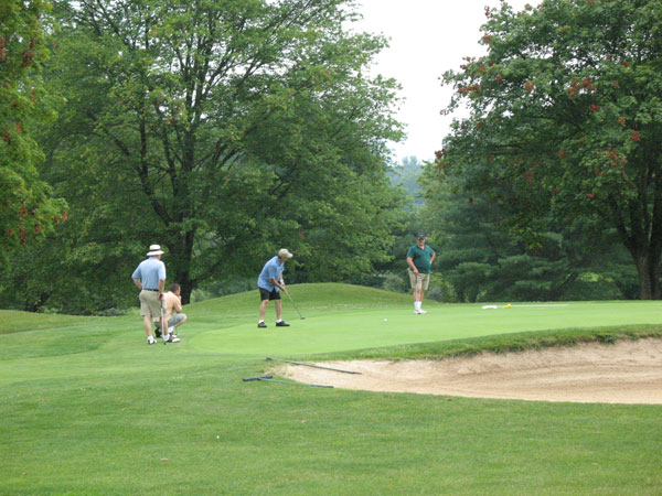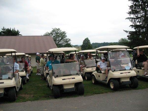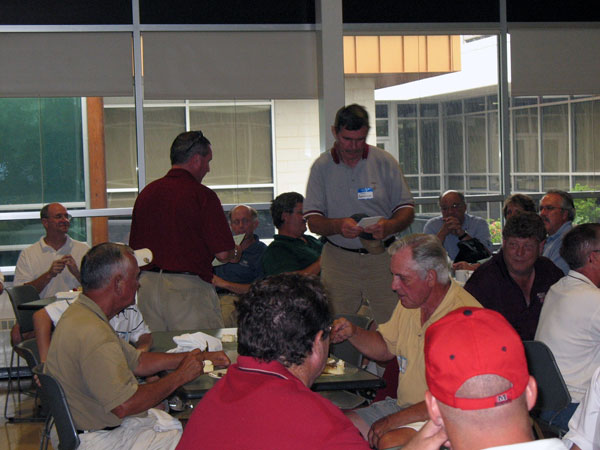 And they're off! Composing a foursome are Paul E. Mach, assistant professor of hospitality management/culinary arts; Wayne R. Longbrake, retired school dean; Damen Wheeland, of Wheeland Lumber Co. Inc., Liberty; and Ken C. Kuhns, assistant professor of electrical technology/occupations Tom Brokenshire, of HRI Inc., accepts a prize from Brett A. Reasner, assistant dean of natural resources management The eighth annual NRM Golf Invitational, held July 9 at the White Deer Golf Course, proved a fun outing for participants and another success for students in Penn College's School of Natural Resources Management. A total of 64 golfers took part, including industry representatives, 16 alumni and 20 college employees among them Wayne R. Longbrake, retired dean of the school. Including this year's contributions, more than $50,000 has been raised for the Natural Resources Management Endowed Scholarship, which made its first award in the Fall 2005 semester. ( Photos by Melissa M. Stocum, coordinator of matriculation and retention, School of Natural Resources Management)