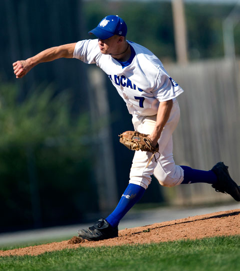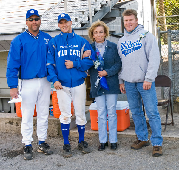 Baseball senior joins coach and parents for group photo Firing heat on a crisp fall day John M. Vitovsky, a pitcher/infielder on the Wildcat baseball team, was honored during Monday's doubleheader against Penn State York at Williamsport's Bowman Field. The construction management major from Waymart was the latest student-athlete to be recognized during "Senior Day" activities in each of Penn College's varsity sports. At far left, Vitovsky is joined by coach Chris Howard and his parents, Alice and John. He also is pictured in action on the mound in Monday's opening game. ( Photos by Jessica L. Tobias, student photographer)