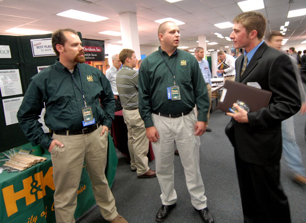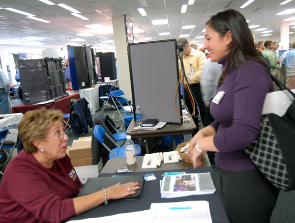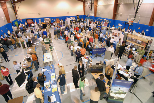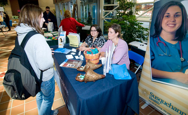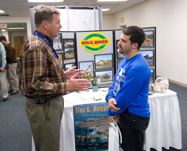 More than 170 employers were on hand at Penn College's Career Expo on Tuesday, offering students a close-up opportunity to say "Hello" to their potential tomorrows. "Another triumphant Career Expo!" said Erin Shultz, the college's coordinator of career development. "We had 173 employers registered, breaking last fall's record of 165. The best part was that those employers came to campus offering a grand total of 899 full-time, part-time, summer, international and internship opportunities for students!" Career Services will share success stories as it receives them, she added, thanking students, staff, faculty and the many volunteers for their efforts. The afternoon event was spread among the Field House, ATHS and LEC; a morning Career Fair at the Schneebeli Earth Science Center paired dozens of companies with students in the School of Natural Resources Management. (