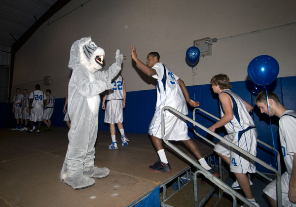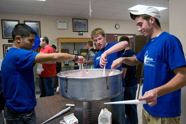 Serving up a sweet treat Showing the mascot some love A student tries her hand at Plinko game Basketball team high-fives the Wildcat during introductions Winter athletes, supporters gather on Field House floor Members of the Penn College community had the opportunity to "Meet the Wildcats" players and coaches from the men's and women's basketball, bowling and dance teams Wednesday in the Field House. The night included free food (including cotton candy and popcorn), T-shirts and spirit towels, a chance to win gift cards and other prizes, and performances by the Dance Team. Winners of gift cards were Andrea Friary, $100; Derek Geisinger and Doug Martin, $50; and Alex Maury, $25. Winners of the Plinko game were Anna Wilson, $40 College Store gift card and $2 cash; Alexandra Davis, $20 College Store gift card and $7; Jay McElmoyle, $10; and Robert Boyd, $7. ( Photos by Kenneth L. Barto and Jessica L. Tobias, student photographers)
