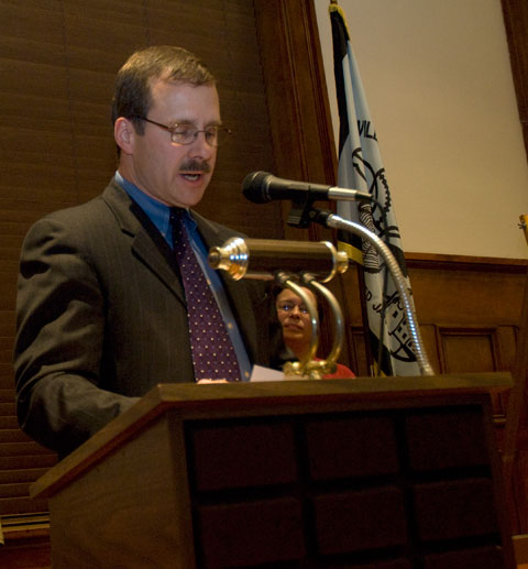Ronald A. Frick, chairman of the Williamsport/Lycoming Chamber of Commerce's College Town Committee, introduces the evening's VIPs Mayor Gabriel J. Campana, right, with Jessica L. Tobias and Joshua W. Brunk Elaine J. Lambert, director of college information and community relations, is acknowledged among Penn College's representatives on the College Town Committee Two of Penn College's recent Students of the Month were among Thursday's honorees at Williamsport City Hall, where they were received by Mayor Gabriel J. Campana and officially introduced during the City Council meeting. Among those honoredduring the College Town portion of the evening were Jessica L. Tobias, a graphic design major from Cogan Station, and Joshua W. Brunk, who graduated with a degree in hospitality management in May and now works in Hershey. ( Photos by Kenneth L. Barto, student photographer)