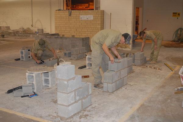Vocational competition held on campus Two dozen students from area high schools and vocational-technical institutions were on the Penn College campus for regional SkillsUSA competition Friday, hoping to earn a spot in the state contest April 1-3 (and, ultimately, in the National Leadership and Skills Conference in Kansas City, Mo., from June 22-26). The students were stationed in a number of college laboratories, ranging from HVAC/plumbing to welding to architectural drafting. In the photo at left, three students judged by two representatives of a local bricklayers union; encouraged by Penn College instructors Glenn R. Luse and Richard R. Motter, and helped by donations from Reynolds Iron Works, Williamsport, and Leonard Block Co, Jersey Shore compete in the School of Construction and Design Technologies' masonry lab.