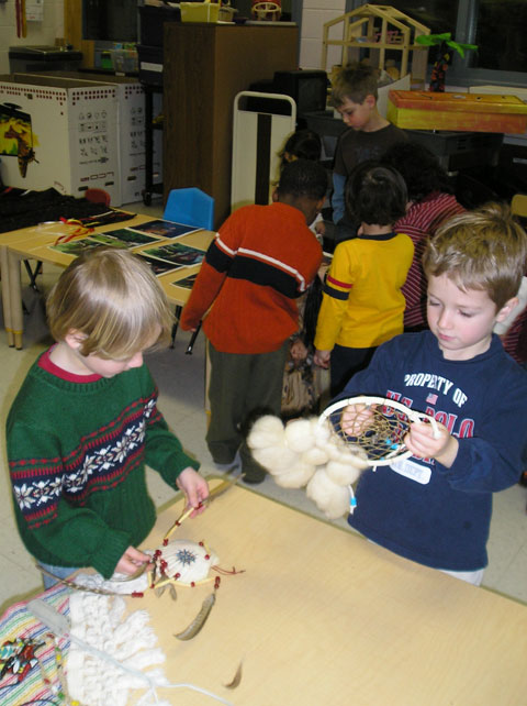 Orion, Bjorn look at a necklace and 'dreamcatcher' A traditional ribbon dress A display of photos A Native American dance Kathleen R. "Kat" Watson, a work-study student at Penn College's Children's Learning Center, recently showed the children how Native Americans dance to drum music, then invited them to join her. The pre-practical nursing major from Cogan Station also brought many Native American items to show the children. Among them were a ribbon dress, a doll, a wedding cup, jewelry and pictures.Photos by Regina G. Andes, assistant group leader in the Bird's Nest