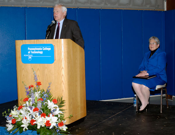 State Sen. Gene Yaw who, as Penn College's solicitor was instrumental in the institution's creation as an affiliate of The Pennsylvania State University two decades ago has been honored with a scholarship in his name. Details are forthcoming, but college President Davie Jane Gilmour broke the news during an appearance at a Thursday event in the campus' Field House. A surprised Yaw then opened the traditional Student Government Seminar, begun more than two decades ago by former state Sen. Roger A. Madigan and continuing under his representation. The event enables students from high schools throughout the 23rd senatorial district to meet with elected officials, members of the state's executive branch, representatives of special-interest groups and members of the news media for a day of panel discussions designed, Yaw said, "to further an interest in education and government and about what people in public service really do."