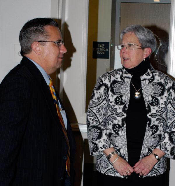Secretary James P. Creedon learns about the senior-project area of the Center for Business & Workforce Development from President Davie Jane Gilmour Attending a weatherization meeting at the BWD James P. Creedon, secretary of the state Department of General Services, paid a return visit to Penn College's main campus Tuesday. Led by Davie Jane Gilmour, college president, and William J. Martin, senior vice president, and accompanied by Beverly A. Hudson, his chief of staff, Creedon briefly surveyed the Stage X building program including the Parkes Automotive Technology Center and met with Larry L. Michael, executive director of workforce and economic development, and John E. Manz, interim director of the Pennsylvania Housing Resource Center. The secretary was among the dignitaries who attended the September 2006 dedication of the college's Madigan Library.