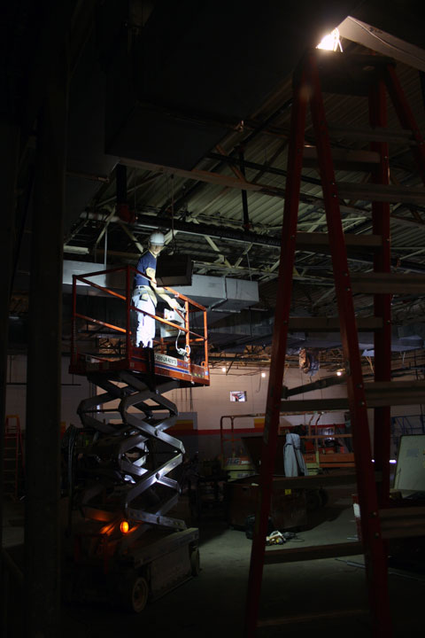 The masonry addition, as well as a portion of the loading dock, are visible on the west side of the MTC The addition on the northwest side of the ATC continues to take shape Structural steel and masonry work mark progress on the college's newest on-campus housing complex A glint of light catches a heating-ventilation-air-conditioning contractor installing ductwork inside the ATC Progress on Penn College's $45.27 million Stage X building program the Dauphin Hall residential complex on the west end of campus and renovations to the Hager Lifelong Education Center, Parkes Automotive Technology Center and Avco-Lycoming Metal Trades Center/Machining Technologies continued under blue skies this week, as evident in this latest look from a sunny-day stroll across campus.Photos by Michael S. Fischer, student photographer