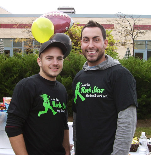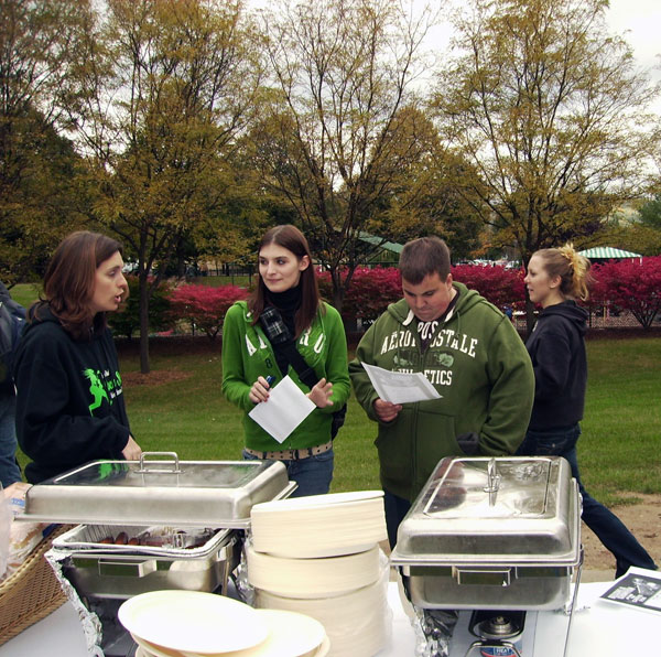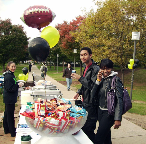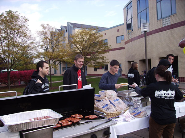 A pair of students don Career Services' 'Rock Star' shirts Dining Services keeps the crowd well-fed Students pause in the lunch line to acknowledge Dana R. Suter, job location and development coordinator (and event photographer) Danielle M. Liddic, nontraditional support/career development specialist, talks with students about Career Fair eventsCoaching from the sidelines of the Campus Center lawn, Career Services staff served more than 200 students at the Pre-Game Tailgate to the Career Fair from 11 a.m.-2 p.m. Tuesday. The event, which included free food, fun and giveaways, began a series of activities that will culminate at the Oct 20-21 Career Fair. Congratulations to the student winners, who can pick up their prizes at the Career Services Office (CC, Room 202): Joel Hague (grand-prize winner), Briana Walker, Ryan Burton, Nancy Ivie, Ilya Bezugly and Crissy Mitinger. A complete Career Fair-related schedule follows: