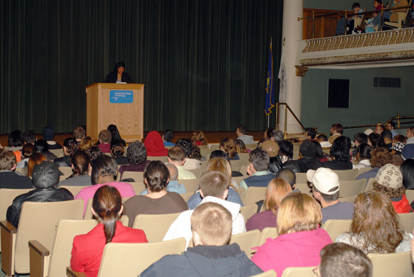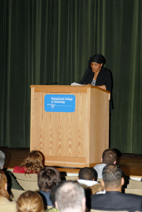 The youngest daughter of Malcolm X challenged Penn College students to find personal meaning in Martin Luther King's words Monday night, issuing a potentially rewarding writing assignment in the process. Speaking at Klump Academic Center in observance of the King Day of Service, educator Malikah Shabazz shared the civil-rights leader's Nobel Peace Prize acceptance speech and asked students to reinterpret it for their own situation. "Go online. Read it. Think about it. And try to ask yourself, at this point in your life: What is your purpose on this earth? Why are you at this (college) and why are you learning what you're learning?" she said, urging students to make the most of their academic privilege. "Take advantage of it; this is your beginning." Shabazz invited students to submit one- to three-page papers about the 1964 Nobel address, telling them their thoughts would be sent to The King Center in Atlanta to compete for two $1,000 prizes and five $500 awards. Accompanied by her 12-year-old daughter, she also held an afternoon question-and-answer session in the Thompson Professional Development Center, offering her perspective on "re-encouraging" students about the value of education amid an economic downturn, faculty's role in cultivating critical thinking, and raising awareness of diversity on and off campus. "Everyone first has to be open to learning about other people their culture, their language, what they eat," she said. "That's what makes someone of a different background feel comfortable, feel like part of your environment. There's not just one culture, one language, one food, one gender. Be genuinely interested in other people." Shabazz's visit was sponsored by the college's Cultural Life Committee, chaired by Kas A. Williams.