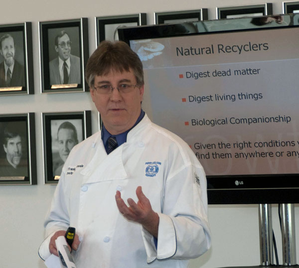 Chef Frank M. Suchwala Marco G. Romano, a culinary arts and systems major from Danville, ladles a sample of mushroom bisque A handwritten sign, hastily added to a library display, serves notice to the overly inquisitive "Mushrooms: Fun to Forage, Fun to Eat" fed a knowledge-hungry audience in the Madigan Library's second-floor reading loft Thursday afternoon. In his hourlong Library Forum, Chef Frank M. Suchwala, instructor of hospitality management/culinary arts at Penn College, provided potentially life-saving tips on identifying edible varieties and shared his love (along with some tasty examples) of mushroom cookery.