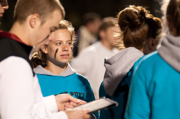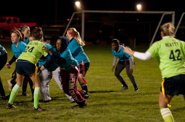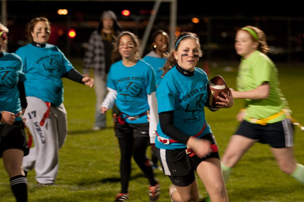 Twice delayed by rain, the annual Powder Puff Football game between On- and Off-Campus women finally was played Tuesday night. Off-Campus struck early, as Jess Foutz connected with Jackie Smith on a touchdown pass to go ahead 7-0. After an On-Campus punt, Amanda Reedy intercepted a Foutz pass to get the ball back. The last play of the first quarter saw Michelle Goodling throw a touchdown pass to Angela Stiles and tie the score at 7-7. The Off-Campus team went three and out to start the second quarter and held On-Campus on a key fourth down, but Off-Campus couldn't move the ball, either. Goodling then delivered a beautiful pass to Grace Guckin to put On-Campus up 14-7 in the second quarter. On the very next attempt, Stiles intercepted an Off-Campus pass to give the On-Campus team momentum as well as the halftime lead. No scoring took place in the third quarter; both teams moved the ball downfield, but all drives eventually stalled. Amanda Allanah had some key runs to wear down the clock in the fourth quarter and give the On-Campus squad a 14-7 victory ... and a 5-4 edge in the series. The winning team, coached by Tyler Kline and Rob Aumiller, consisted of Foutz, Smith, Ashley Beatty, Ashley Lombard, Sarah Daugherty, Fallon Bond, Kiersten Totten, Cricket Eastabrook, Meghan Rohrbaugh, Jess Houser, Janis Laverty and Michelle Perkins. Their On-Campus counterparts, coached by Josh Wilson, Kyle Stuart, Kyle Mullins, Greg Miller, Shawn Bradley, Lawson Miller and Jaime Ackerman, consisted of Ackerman, Stiles, Reedy, Goodling, Allanah, Guckin, Alyse Poswiatosky, Alie Fields, Kristen Winslow, Sheila Katzaman, Rachel Emmons, Amanda Sherry, Chelsea Emel, Brittany Davis, Steph Karoullas, Jocelyn Moyer, Holly Raybuck, Brooke Arment, Lindsey Anderson and Shaana Exantus. The preceding game summary was provided by intramural assistant Jeremy R. Bottorf, who said a big "Thank you" to Enifien Okoro and Angel Stroud for working the chains; to Brandon Sauers, Joe Simon and Greg Solyak for refereeing; and to Nate Ellis, Ben Vess and Russell Blankenship for working the clock.