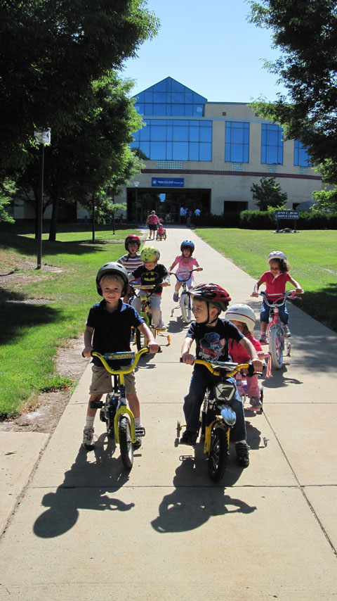 Biking Birds and Bears The Bird's Nest and Bear Bunch from the Children's Learning Center had their first bike day of theseason on Tuesday. The youngsters brought their own bikes and safety helmets from home and enjoyed a ride fromPenn College'sBush Campus Center to the tennis courts. Photo by Regina G. Andes, assistant group leader