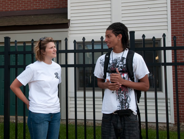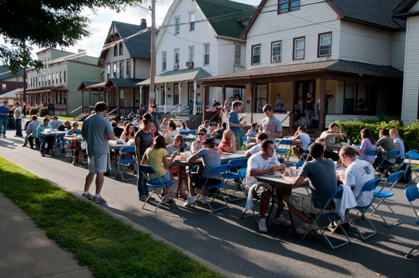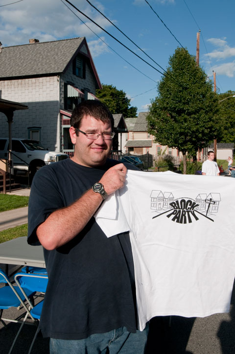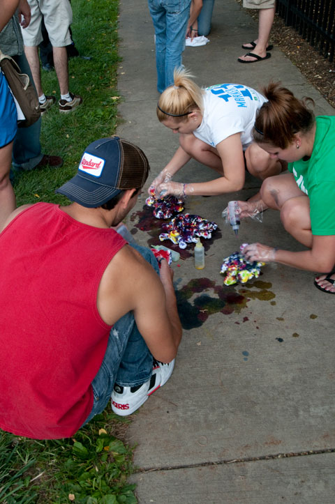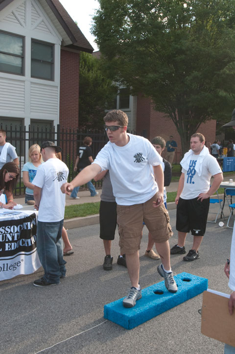 Student Brad Foster displays an event T-shirt Anthony Grubbs (in red), a Resident Assistant at The Village at Penn College, shares his tie-dye expertise with students Participants enjoy food, opportunity to get acquainted Katie Mackey, coordinator of off-campus student housing, talks with off-campus resident Giordano Reynoso Student Donald Bathurst III plays a game of Washers The Vine Avenue Block Party, held annually for off-campus students as part of Student Activities' PC3 initiative, was hosted Thursday night by Penn College's three Community Assistants (Kattie Heisey, Kyle Mabry and Corey Shank). The Cell Block's Zack Lee was guest DJ, and participants were treated to pizza, wings and kegs of birch beer. There also were several outdoor games in which students could receive raffle tickets for prizes donated by The College Store and several community businesses. Organizers also gave away 150 T-shirts, designed by student Mike Snyder, that attendees had the option of tie-dyeing. Photos by Sarah K. Mariano, student photographer