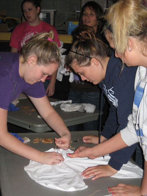 The Wildcat women's volleyball team thanks everyone who came to its Pink-Out Tie-Dye event Monday night. With the help of Field House staff (including Angel V. Stroud, Lisa J. Worth and Jeremy R. Bottorf), and equipment supplied by Penn College General Services, the rear storage area of the building was transformed into a tie-dye party. The team would have a hard time not counting the event a success; its members assisted a steady flow of people to create masterpieces in pink. Every open surface became a holding rack for T-shirts anticipated to be worn in an attempt to raise awareness for the fight against breast cancer. Fortunately, rainy skies were no hindrance, as shirts were taken outside to be rinsed before rubber bands were removed to reveal yet another unique design. The event lasted beyond the expected end time of 8 p.m., as several of the fall sports teams, one sorority, a variety of curious college students and friends of the volleyball players came to show their support. Additionally, teams that will be traveling and unable to attend the Pink-Out event in Bardo Gym were encouraged to wear their shirts later this week to let others know there is "something pink" happening, said coach Bambi A. Hawkins, who looks forward to a successful Pink-Out at the matches to be hosted by the women's volleyball team starting at 1 p.m. Saturday. There also will be a 50-50 drawing to benefit the American Cancer Society and the first 100 people through the door will receive a free awareness bracelet and reminder card.