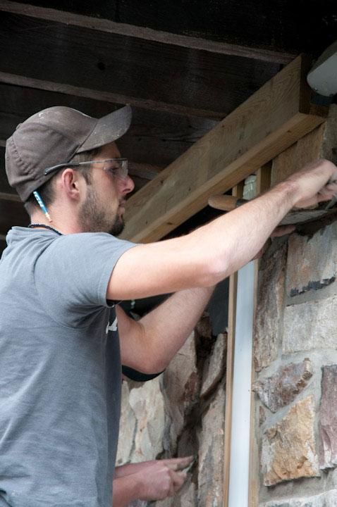 Corvin K. Oberholtzer, of Wellsboro, uses a slicker tool to compress the mortar and assure a tight fit once the stone has been bedded into place The mark of a skilled mason (represented here by student Travis M. Cain, of Bloomsburg) is the ability to read the stone and understand its composition, then to cut and shape it to fit into the puzzle Instructor Glenn R. Luse, standing at right, with his 2010-11 masonry studentsMasonry students from Penn College's School of Construction and Design Technologies recently constructed a natural stone veneer for the auditorium at New Tribes Mission Institute near Jersey Shore. Instructor Glenn R. Luse said the endeavor among the latest in a historical series of community-serviceprojects undertakenby a variety of college majors and organizations was challenging because students needed to match the 60-year-old stonework on the lower portion of the building. "The masonry students did an excellent job all around," Luse said. "Their accomplishments have left a mark on and off campus. These remarkable students have challenged my abilities and have made me a better instructor." Photos by Sarah K. Mariano, student photographer