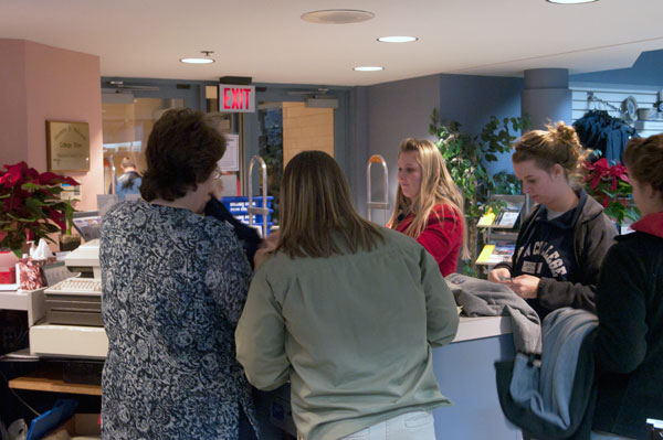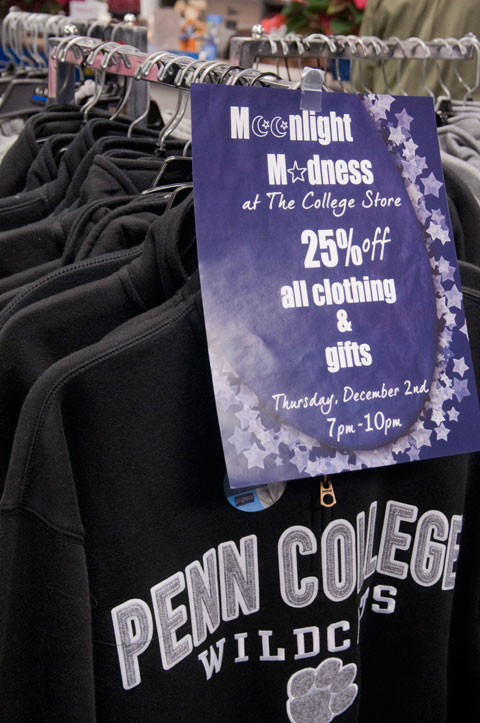 Bargain-hunters converge on the sales floor Sign points the way to discounted merchandise Shoppers crowd the storefront registerThe traditional Moonlight Madness sale was held at The College Store from 7-10 p.m. Thursday. As Penn College counts down to the yearend semester break, shoppers enjoyed 25-percent discounts on clothing and gifts, holiday books, games and toys. Photos by Sarah K. Mariano, student photographer