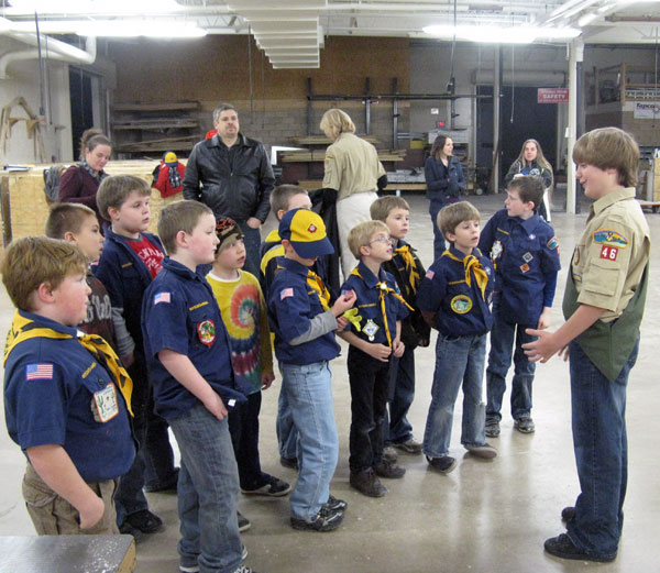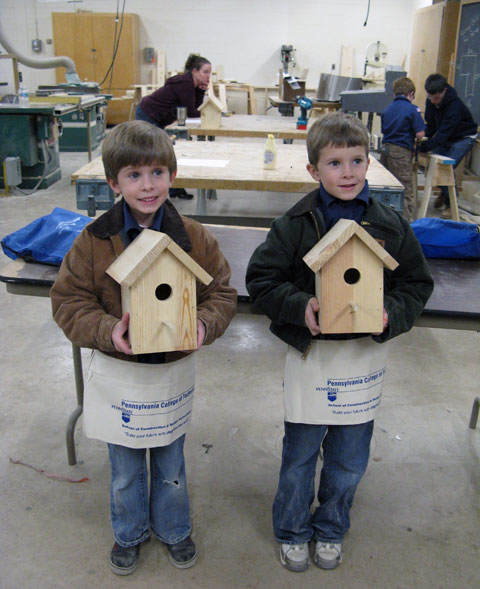 On Thursday night, the Penn College Construction Association hosted a hands-on activity for about a dozen Cub Scouts from Den 38 (St. Ann's Roman Catholic Church). The Scouts, in the process of earning their Wolf patches, needed to complete a Building and Fixing requirement as part of that process. Each Scout constructed a bird house, which helped him gain a better understanding of the proper use of basic hand tools. Pack 38's leader, Lori Rexroth, contacted the School of Construction and Design Technologies to request help with the requirement, and PCCA President Brian West organized the activity with the guidance of Barney Kahn (the club's faculty adviser). Reagan McCoy, a first-class Boy Scout from Troop 46 in Lock Haven, welcomed the Scouts to campus by describing some of the experiences he has enjoyed in his troop, and encouraged them to continue to travel the Scouting trail into the Boy Scouts when eligible to do so. "Our students from the PCCA truly did a great job of working with each Scout, making the evening a fun and memorable learning experience," said Steven K. McCoy, Reagan's father and coordinator of matriculation and retention for the School of Construction and Design Technologies. At the conclusion of the evening, the boys were given a Penn College backpack with a logo T-shirt and nail apron to commemorate their visit, courtesy of the Admissions Office and the School of Construction and Design Technologies.