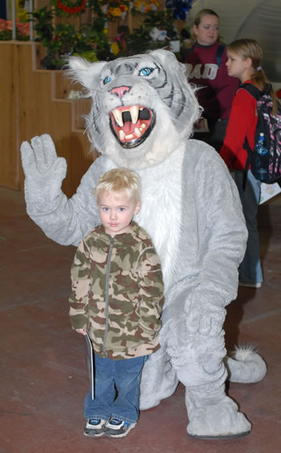 Penn College's Wildcat mascot attracts a "high five" from a new friend.