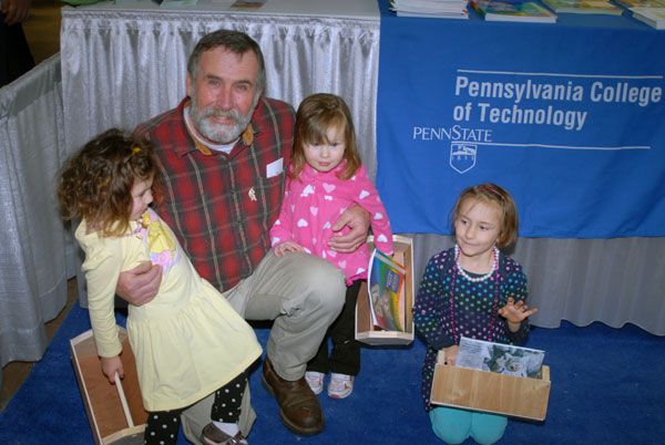 Steven K. McCoy, coordinator of matriculation and retention for the School of Construction and Design Technologies, helps 10-year-old twins Elizabeth and Micah Hillegass, of Dauphin.