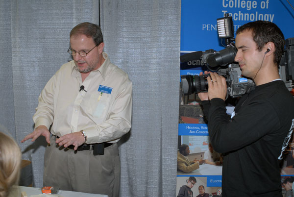 An animated Steven K. McCoy explains the toolbox-building operation for a roving Pennsylvania Cable Network correspondent..