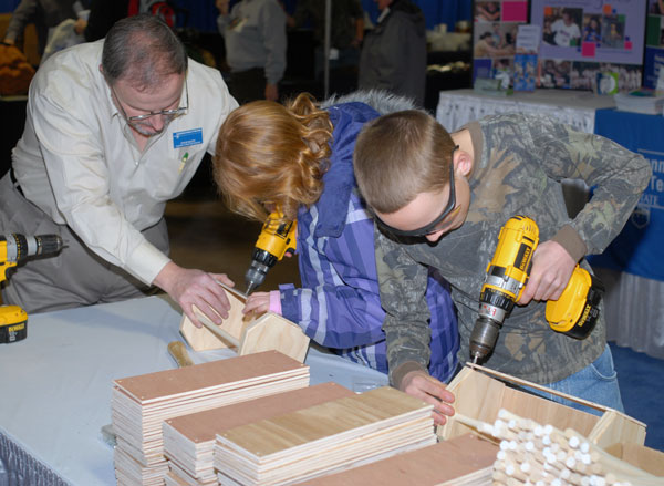 A young carpenter-in-training hands a wood screw to his mentor at the School of Construction and Design Technologies exhibit.