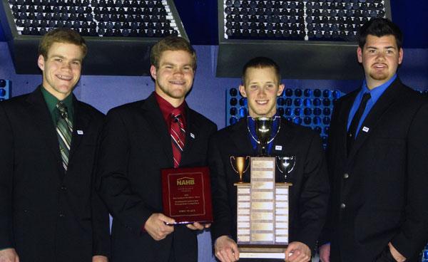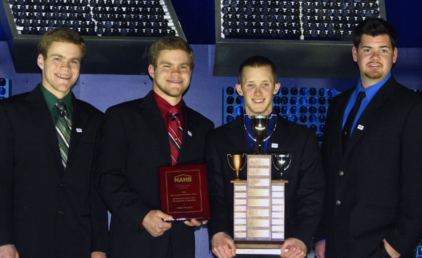 A team of two-year students from Penn College's School of Construction and Design Technologies claimed first-place honors at this year's National Association of Home Builders Residential Construction Management Competition held during last weekend's 2011 International Builders Show in Orlando, Fla. Members of the championship team, coached by Barney A. Kahn, instructor of building construction technology, were Thomas Whitehouse, Brandt and Brent Hey, and Shane Beckner. Brigham Young University placed second in the two-year competition; North Dakota State College of Science finished third. A team of four-year construction students also competed. Coached by Garret Graff, assistant professor of building construction technology, they were Zachary McAllister, Michael Buchalski, Michaele Incontro, Erin Smith, Caleb Baechtle and Nicholas Forrester. The top finishers among four-year teams were Cal Poly, first; Middle Tennessee State University, second; and Brigham Young, third. The teams both of which represented the Penn College Construction Association were among 50 representing universities, community colleges, high schools and career technical schools that participated in the competition, which gives students a real-life construction-management project to solve in presentations to a panel of industry judges.