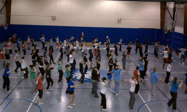 A blur of purposeful motion The view from upstairs Zumba participants fill the Field House floor with energy to burnAs part of Healthy Weight Week 2011 organized by Healthy Wildcats and Student Health Services, and "Short Courses" offered by Student Activities, Zumba attracted more than 90 Penn College students and staff (women and men) to the Field House on Tuesday night for a taste of Latin-infused fitness and fun. Another chance to try a free Zumba class is offered at 6:30 p.m. Thursday at the Field House. Photos by Kristi L. Hammaker, health and fitness specialist