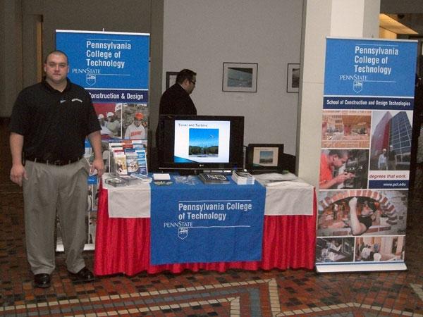 Penn College was among 26 exhibitors at the Career and Technical Education celebration Feb. 8-9 in the East Wing Rotunda of the Capitol Building in Harrisburg. The college's renewable energy technologies and building science and sustainable design majors were among the key programs highlighted during Tuesday's opening ceremonies. Students, teachers and the public were welcome to visit the invited schools' displays; the Penn College table featured a PowerPoint slide show of the newest "green building technology" majors offered by the School of Construction and Design Technologies. Visitors also had the opportunity to view the online Sunny Portal, which illustrates the college's cost and energy savings realized from an array of solar panels that students installed to serve the Victorian House. Geoffrey M. Campbell (assistant professor of architectural technology) and Wayne E. Gebhart (assistant professor of electrical technologies/occupations) deftly fielded questions from guests, while Jason T. Maddox, of South Williamsport (a building science and sustainable design major/president of the newly organized student chapter of the United States Green Building Council), was available to offer a student's perspective of both programs. State Sen. Gene Yaw and state Rep. Rick Mirabito were among those who visited the college's display.Photos provided by Steven K. McCoy, coordinator of matriculation and retention for the School of Construction and Design Technologies