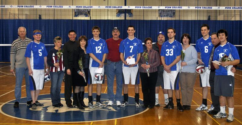 The six graduating seniors on the Penn College men's volleyball team Brad Bell, Andrew Epley, Colin Grube, Jared Palko, Philip Reist and Matthew Stoltz all were honored by head coach Wes Strayer prior to their Saturday game against an alumni squad. Bell, a graphic design major from Harrisburg, is in his fourth season for the Wildcats. Strayer recalled his ability to stay positive and adjust to changing positions on the team. Epley, a computer aided product design major from Littlestown, came to the team as a sophomore. Characterized by his coach as a strong leader and presence on the court, he also was recognized for helping the team in nationals last year. Grube, a forest technology student from Trucksville in his second year on the team, has improved so much and will be remembered as the jokester on the team. Palko, an automotive technology major from Waymart and another four-year member of the team, was celebrated for his consistent improvement on defense and for his back-row attack. Reist, a aanufacturing engineering technology major from Washington Boro, also is a four-year member. His intensity and hustle on the court are second to none, the coach said, even when he played on a broken bone. The team also paid tribute to Stoltz, a physician assistant major from DuBois. He has been with the team for four years, but, due to conflicts with rotations in his major, had to miss a significant amount of this season. The alumni defeated the Penn College team, 3-1, in an exciting upset.
