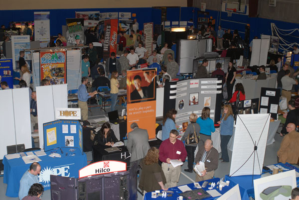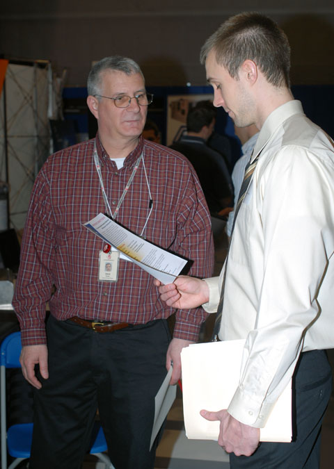 Alumnus Bernard P. Schott (1987, toolmaking technology) welcomes a student to the Weldon Solutions display in this photo by Michael S. Fischer, student photographer More than 100 employers set up shop in the Field House to network with students and alumni at the spring Career Fair Alumni Jason Tolley, left, and Tom Paisley talk with Lane Ackerman, a construction management major, at The H&K Group booth L-3 Communications Electron Devices' David Godlin shares information with computer aided product design student Zachary Brook Heavy Career Fair traffic is evident at the Kokosing Construction Inc. booth, where Brett Burgett, right, was among employees recruiting from among Penn College students and graduatesNearly 110 employers were at Penn College's Career Fair on Tuesday, visiting main campus and the Schneebeli Earth Science Center to offer students and alumni an incredible networking opportunity for more than 1,250 full- and part-time jobs and internships. WBRE's Stef Davis stopped by the Field House late Tuesday morning; her piece on the Career Fair including an interview with Erin S. Shultz, coordinator of career development was broadcast Tuesday evening. An Aviation Career Fair also was held at the Lumley Aviation Center in Montoursville from 10 a.m.-noon Wednesday.