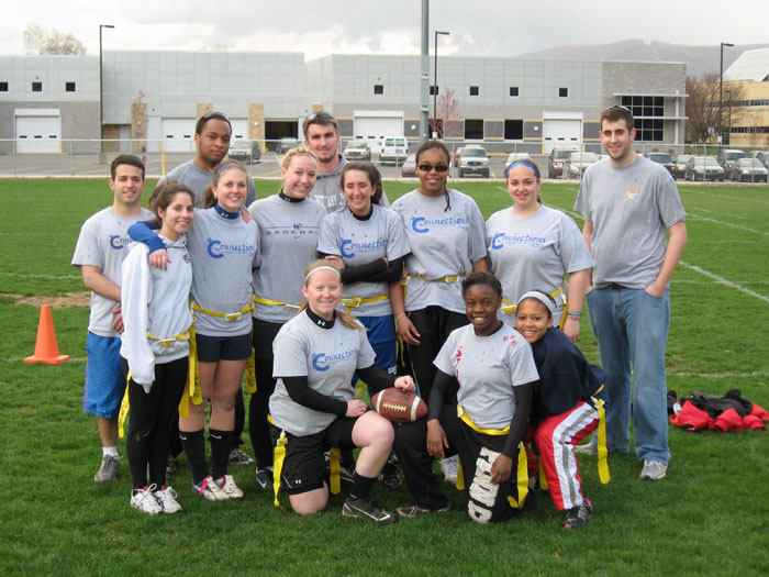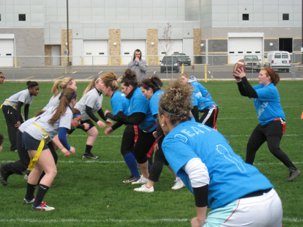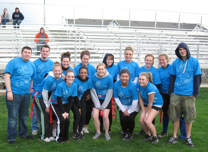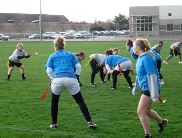 The on-campus team came out with a good mix of runs and passes to keep its off-campus opponents on their heels, and, when it was all said and done, Sunday's Powder Puff Football game might well have been called "The Kerry Weber Show." For starters, according to a recap by intramural assistant Jeremy R. Bottorf (who also provided the photos), on-campus quarterback Michelle Goodling found Weber on a pass play to put the team up 7-0. Just as the rain threatened, so did the off-campus squad, starting a drive of its own only to turn over the ball on downs. Midway through the second quarter, the on-campus team reached into its bag of tricks: Amanda Allanah took the ball on a reverse and set up great field position; Stephania Karoullas then took the direct snap "to the house" to boost the score to 14-0 at halftime. The on-campus team was not done, however. Goodling came out with another beautiful pass to Weber to put the team up 21-0. A fired-up off-campus team began driving downfield, with coach Josh Wilson changing things up by going to a two-quarterback system involving Tiffany Deihm and Amanda Reedy. On a switch of its own, the on-campus team put in Alysia Brown at quarterback; she hooked up on a bomb to (who else?) Weber, to make the score 28-0. A few plays later, Weber again took a deflected ball into the end zone for the 35-0 final score. Assisting Wilson with the off-campus team were Jake Parsons and Shawn Bradley. The on-campus team was coached by Kyle Baker and assistants Brandon Haney and Allen Brown. Bottorf shared a "big thank you" to all the players; to Greg Solyak, Donnie Stevenson and Ben Vincent for refereeing; to Dylan Lackey and Chad Chervinsky for working the chains ... and to Mother Nature, who kept the rain on the other side of the mountain until the game could be completed. Sign-ups for the Homecoming Powder Puff Football Game will begin in mid-September, he added.