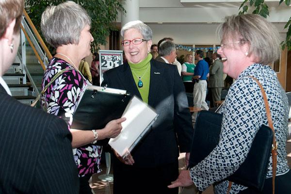 Penn College President Davie Jane Gilmour, center, greets 'Road Scholars" tour participants in the lobby of the Student and Administrative Services Center.