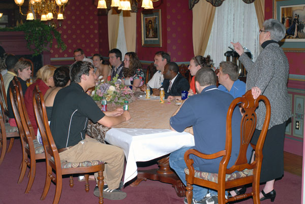 President Davie Jane Gilmour gets a preview of the Connections team's planned program for incoming studentsPenn College's summerlong Connections orientation program drew closer to its opening session Thursday morning, as staff gathered in the Victorian House to get acquainted. College President Davie Jane Gilmour joined co-workers in a breakfast meetingwith student representatives, known as "Links" for the relationships they will forge between the college and its newest enrollees and their families. Among those attending the get-together were David Kay, vice president for college services; Carolyn R. Strickland, assistant vice president for academic services; Elliott Strickland, interim chief student affairs officer; and Erin M. Datteri, assistant director of student activities for Greek life and leadership. The first Connections session will be June 22-23; additional orientation opportunities are scheduled through mid-July.