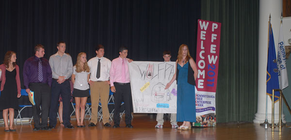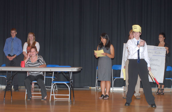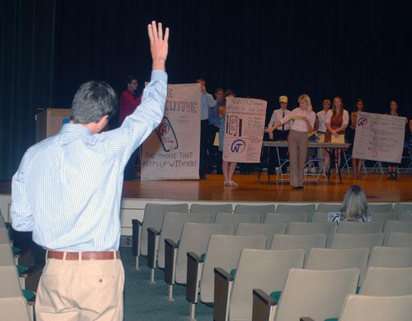 A timekeeping teammate lends a hand to his colleagues Team members enact a television commercial for their Executive-brand cellphone An imaginary company manufacturing the Wolfpak backpack for high school students offers its marketing plan Complete with props and humor, the Sparq cellphone corporation presents its ad campaign Students spending Pennsylvania Free Enterprise Week on campus delivered their closing presentations Friday, pitching their fictitious companies' products to a panel of judges in the Klump Academic Center Auditorium. More than 300 high school students attended the PFEW session, hearing from a variety of business and industry representatives, as well as touring campus, making friends and having a fair amount of fun in the process.