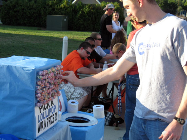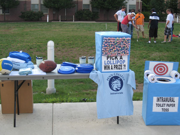 During an intramural picnic at Tuesday's "Hot Dog You're Here" event, the staff/faculty volleyball team once again claimed victory at the students' expense. The employees took the match, two games to none. As students discovered how much fun the game was, the staff/faculty team soon was playing against as many as 18 students, who rotated after each serve. "Dan Warner kept his cool and kept his teammates calm under all the pressure of this match," said Jeremy R. Bottorf, intramural assistant, who also provided the photos above. "This match was extra important to Warner after losing in the spring to the students to snap his three-game winning streak." While the game was taking place, students were busy at the intramural table playing Plinko and a new intramural game, Toilet Paper Toss. "A big 'Thank you' to Residence Life for working with the Intramural Department during 'Hot Dog You're Here!'" added Bottorf, who reminds students that there is only little more than a week to register flag football and sand volleyball teams at the Field House.
