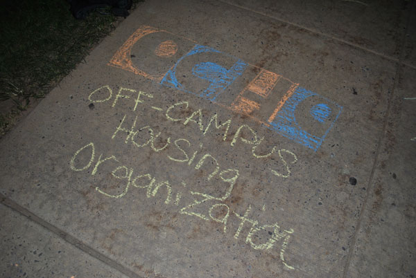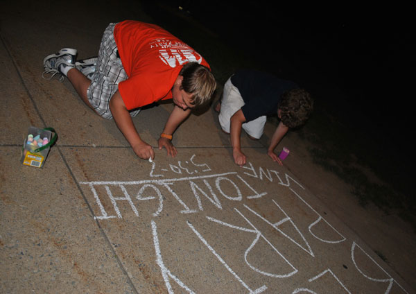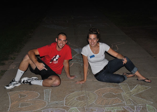 At Penn College, those sidewalks underfoot might carry valuable information about an upcoming campus event ... such as a Block Party sponsored by the Off-Campus Housing Organization and the college's Community Assistants. With chalk in hand on the eve of their planned Thursday bash, both groups worked for two and a half hours to colorfully prepare their message for the following day's pedestrians. Rain washed away their creativity, as well as the event, which has been rescheduled for Thursday, Sept.8, along Vine Avenue (behind The Village).