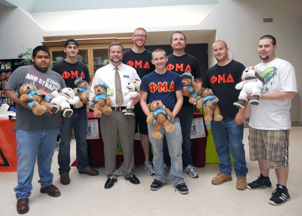 Phi Mu Delta's Kaleb B. Price and Dennette D. Roan, a student and employee of Kay Jewelers, were the main organizers of the event The Phi Mu Deltas with their bears ... and their adviser, Jeffrey D. Filko, assistant director of Dining Services Fraternity representative Eric A. Goeringer, left, with student Timothy B. Boring, who won a Jane Seymour Open Heart Collection necklace Phi Mu Delta and Kay Jewelers sold teddy bears and raffled a necklace on Tuesday, raising $800 for St. Jude Children's Hospital. The retailer and fraternity work closely with the hospital, which provides medical care to youngsters with no regard to a family's ability to pay, and collected its sizable donation in a matter of hours outside the Keystone Dining Room. Photos provided by Phi Mu Delta