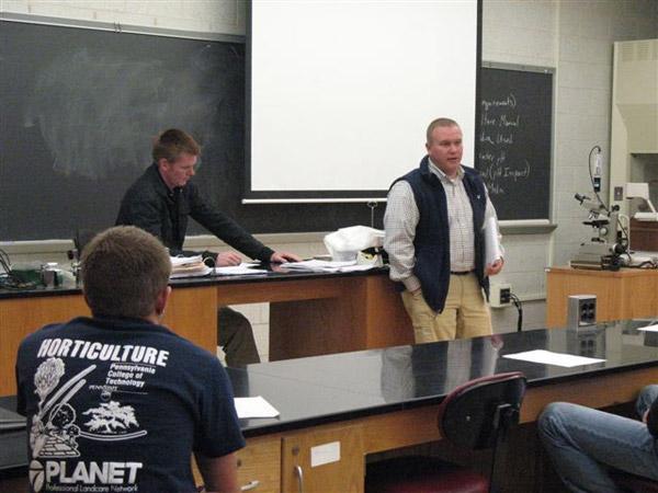 A May 2010 ornamental horticulture graduate returned to Penn College's School of Natural Resources Management on Thursday, speaking to students in Carol A. Lugg's First Year Experience course and Carl J. Bower Jr.'s Landscape Operations class. "If you care about your education, you will get so much more from this experience," students were advised by Garrett M. Book, now employed by Earth, Turf & Wood Inc. in Lancaster County. "Graduating from Penn College isn't the end of your education, it is just the beginning." To prepare her students for the alumnus' Schneebeli Earth Science Center homecoming, Lugg the school's matriculation and retention coordinator, who also provided the photos above showed them a video of Book's commencement address. "Garrett is a perfect example of how you never know what life will bring," Bower said. "Being prepared for anything and working hardare the keys to success. That was the lesson I was hoping my students would get."