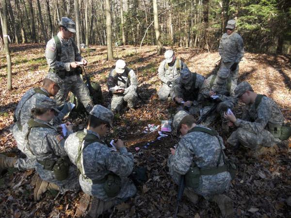This past weekend, the Bison Battalion the Bucknell University-based ROTC program comprising Bucknell, Bloomsburg and Susquehanna universities, Penn College and Lycoming College conducted fall Field Training Exercises at Camp Karoondinha in Glen Iron. The training consisted of situational exercises and day/night land navigation to further develop cadets'aptitude as future leaders. Cadets were introduced to battle drills and the techniques for conducting tactical missions, such as how to react to enemy contact, set up an ambush and successfully perform a recon mission. While learning the doctrines of specific tactics required for each mission, cadets also were working to improve their knowledge and confidence and to hone their leadership. During land navigation, the cadets used a magnetic compass and protractor to determine distances and directions of points on a map, planned which route to take, and retrieved codes posted at each point.