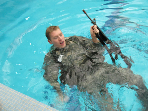 With dummy weapon in hand, a cadet prepares to 'ditch' his gear A blindfolded cadet is helped to the edge of the jumping-off point On survival manuevers, Bison Battalion fills the Bucknell University poolBison Battalion ROTC, along with nine members of the Junior Reserve Officer Training Corps from Shikellamy High School, completed Combat Water Survival Training over the weekend to improve individual confidence levels, build unit cohesion and prepare cadets for continuing training. The event took place at the Bucknell University swimming pool from 10 a.m.-noon Saturday. The cadets swam for 10 minutes and treaded water for five, then performed a 15-meter swim with a dummy M-16 and load-bearing vest. After that, they took part in the "equipment ditch" event, entering the pool anddumping their mock M-16s and vests before resurfacing. Lastly, they jumped into the pool from a 3-meter platform with dummy weapons while wearing vests and blindfolds. Bison Battalion, based at Bucknell, includes a number of Penn College students. Photos by Cadet Jason Kneller, public affairs officer