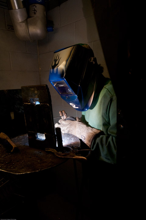 Alumnus Adam Steppe, right, inspects a weld during the postsecondary contest Competition spotlights young welders A hammer-wielding high school competitor chips away the slag from his weld American Welding Society judge Niles Oerhli checks a student's couponPenn College hosted the annual American Welding Society Welding Competition for secondary and postsecondary welding students Friday morning. Judged by representatives from the Central Pennsylvania Chapter of the American Welding Society, students from Penn College's welding majors competed against one another, followed by a competition among students from Williamsport Area High School, Columbia Montour Area Vocational-Technical School and SUN Area Technical School. Niles Oehrli, of Moody International; and Adam Steppe, '99 and '11, of High Steel Industries, judged the students' work. Winners will be announced during a banquet in April. Middle photos by Michael S. Fischer, student photographer