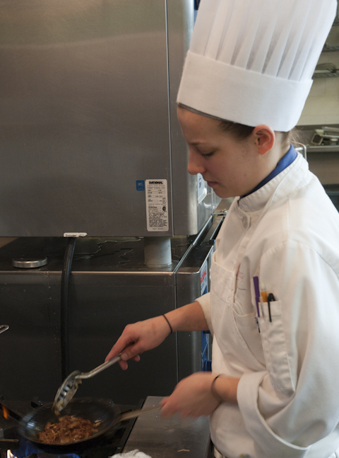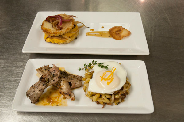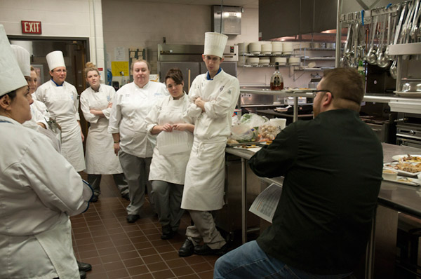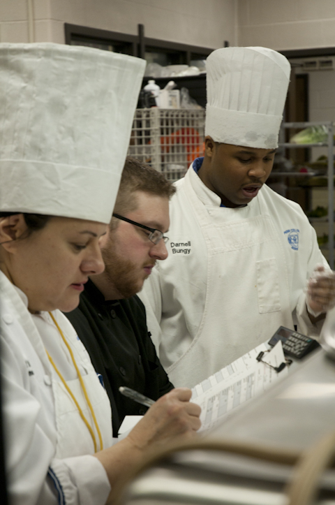 Senior students in the culinary arts and systems major raced against the clock to create three dishes that would impress the judges during the first cooking challenge in their Culinary Competition and Skills Assessment course. Serving as judges were the Williamsport Country Club's Chef Christopher R. Grove, a 2008 alumnus and part-time instructor of culinary arts, and their instructor, Chef Mary G. Trometter, assistant professor of hospitality management/culinary arts. Using four ingredients revealed two days before macaroni, juniper berries, butternut squash and bacon plus two secret ingredients rabbit and lager revealed at the opening of the recent competition, the students split into two teams to create an appetizer, entrée and dessert. Team Heads, made up of Skylar K. Burke, of Warriors Mark; Katelyn R. Ciavardini, of Sayre; Kevin W. Pysher, of East Stroudsburg; Angela J. Snyder, of Lock Haven; and Aimee M. Stout, if Middletown, N.Y., narrowly defeated team Tails, made up of Darnell R. Bungy, of Williamsport; Rachel M. Emmons, of Washington, N.J.; Marlee M. Horchen, of Johnsonburg; Cody J. Miller, of Cogan Station; and Robert L. Robinson, of Sunbury.