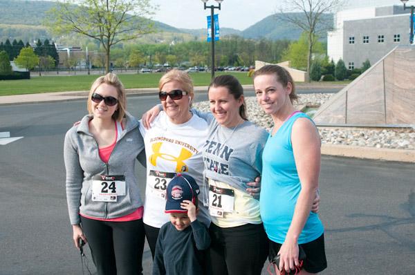 Ashkei Bower, a 2009 dental hygiene alumna; April Manley, a 1990 dental hygiene graduate, Amber L. March, a dental hygiene student, and Aimee Dreese pose with a young fan prior to the race start Emily B. Miller, instructor of fitness and lifetime sports/physical fitness, reviews details with participants The runners head off The gentle warmth of Saturday morning's sunlight couples with a scenic campus backdrop Miller checks the finish time of a conquering runnerPenn College's School of Health Sciences hosted its fourth 5K Walk/Run on Saturday to support a scholarship for students in the college's health sciences majors. Net proceeds from the race support the School of Health Sciences Endowed Scholarship Fund, with the goal of building the fund to an endowment of at least $25,000, after which it will become a permanent source of scholarship awards.