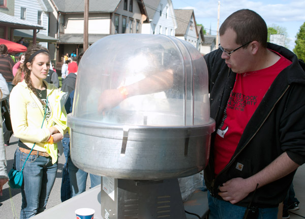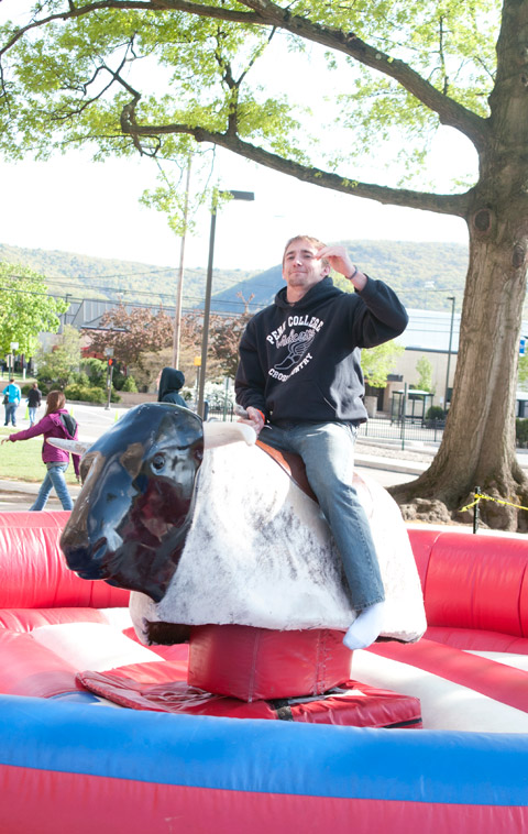 Hellogoodbye entertains the Vine Avenue gathering Ladder golf among the free activities Cotton candy always a popular treat Student Heavy construction equipment technology major Travis M. Cain attempts to conquer the bucking bull Couch, chairs become patio furniture when an alfresco party beckons Two formerly separate spring traditions the Wildcat Events Board's WEBstock festival and the Off-Campus Housing Organization's block party were combined into one jam-packed, fun-filled, crowd-pleasing extravaganza Friday. The hybrid event, held along Vine Avenue on the north side of Penn College's campus, included music, free food, novelties and games. Nearly 500 people attended, one of the largest crowds in the events' history. Photos by Michael S. Fischer, student photographer