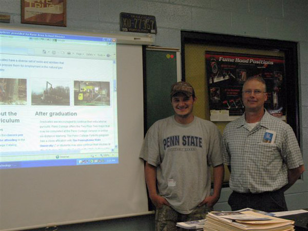 Forest technology student Dustin S. Beane and Carol A. Lugg, coordinator of matriculation and retention for the School of Natural Resources Management, visited students enrolled in the forestry program at Kane Area High School on Thursday to discuss opportunities in Penn College's forest technology major. Beane shared his college experience with more than 40 high school students throughout the day, and had the opportunity to catch up with his former teacher, Jack Detrick, who commented, "It is always nice to see former students, especially when they are successful." Beane, who graduated from Kane in 2008, said, "I enjoyed sharing my Penn College experience with students at Kane High School. I'm back home ... working a summer job at a forestry consulting business, so I didn't mind heading to the high school and talking about the forest technology program at Penn College."Photo by Carol A. Lugg
