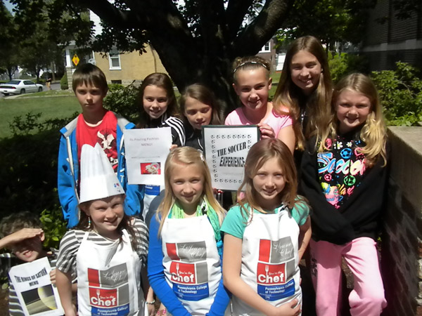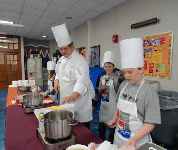 Chef Paul Mach, assistant professor of hospitality management/culinary arts and co-host of the Penn College/WVIA television series “You’re the Chef,” recently helped kick off a thematic unit on restaurants for fifth-grade students at Rommelt Elementary School in South Williamsport. Each year, Chef Paul visits the school at the beginning of the unit to provide a cooking demonstration and discuss restaurant planning, including names, themes, and food dishes from other countries and what makes them unique. According to language arts teacher Jodi Puller, the students work in groups for about a week to create an imaginary restaurant, write a fictional history for the restaurant, lay out a floor plan, write a menu using figurative language, and prepare a poster to warn about the hazards of cross-contamination and undercooked food, all the while practicing their reading, language arts, science and math skills. The students present their final products in a competition with other groups from the school.Photos courtesy of Rommelt Elementary School