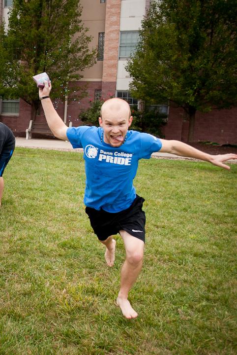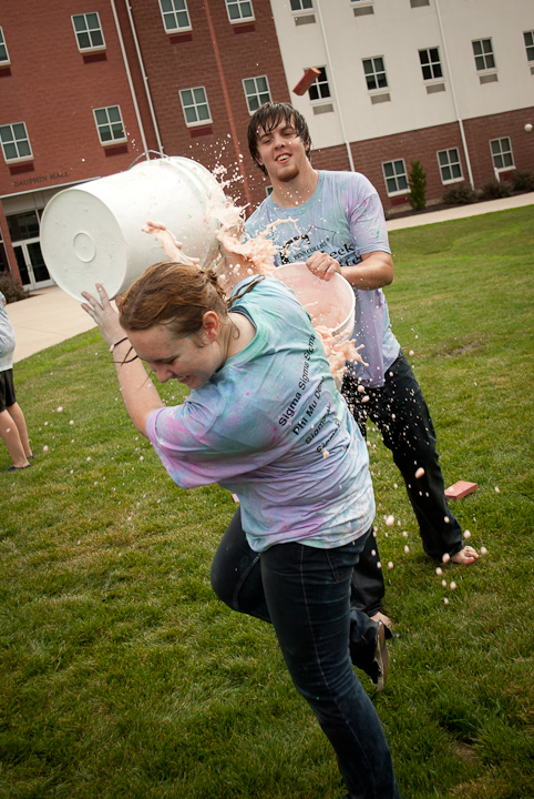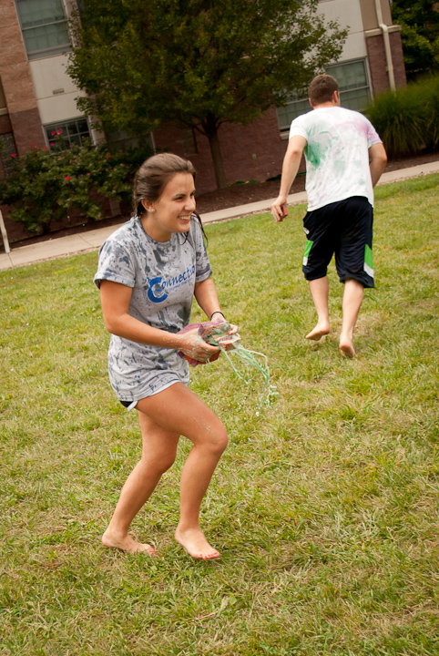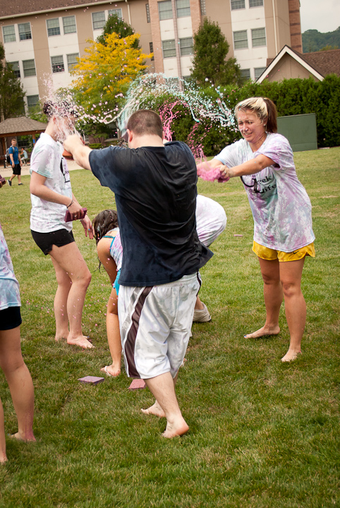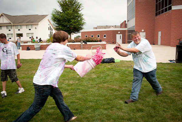 About 35 students traded their Sunday best for their Tuesday worst, girding for boisterous battle in the third annual Greek Life/Intra-Fraternity Council "Color Wars" competition. Clad in stainable duds and launching sponges drenched in nontoxic, washable paint, teams had some wet-and-wild fun while defending the courtyard outside Penn College's Rose Street Apartments. The event is part of Greek Week activities, focused on recruiting members to the three campus fraternities and establishing a sorority interest group. A limited number of free T-shirts were handed out to participants.