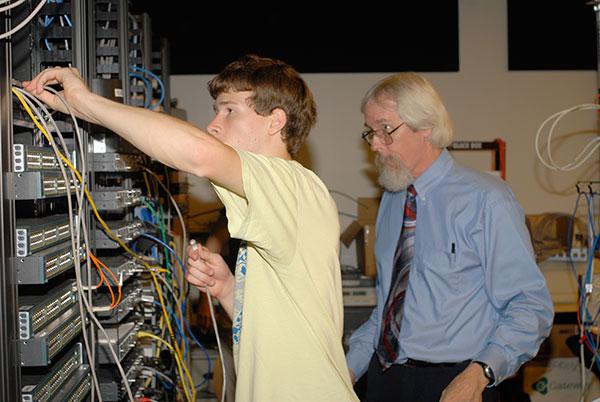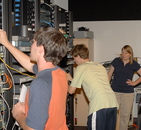 First-year residents of the Information Technology Living-Learning Community visited the Cisco Networking Academy laboratory Thursday afternoon for a hands-on router exercise led by Jeff B. Weaver, associate professor of electronics in the School of Industrial and Engineering Technologies. The college's Residence Life Office offers a variety of living-learning communities on campus, catering to students enrolled in the same academic majors. The IT contingent was accompanied by Taylor R. Lapointe, an information technology: information assurance and security concentration major from Pelham, N.H. (and Resident Assistant for the living-learning community), and Sandra Gorka, associate professor of computer science in the School of Business and Computer Technologies.