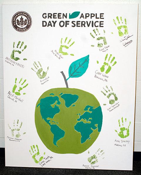 Students in Penn College's School of Construction and Design Technologies created murals to commemorate the first Green Apple Day of Service, a Sept. 29 event that champions "healthy, sustainable schools" through community involvement. As a project for Naim N. Jabbour's Sustainability and Living Green class, the students – a number of whom are enrolled in the college's four-year building science and sustainable design major – went well beyond green in colorful observance of the occasion. One of the paintings depicts an apple-shaped globe, "signed" with the handprints of Jabbour, an architectural technology instructor, and 11 students: Kendel F. Baier, Jersey Shore; Kianna L. Funk, Hershey; Matthew J. Glodowski, Moorestown, N.J.; Reece A. Gonsar, Halifax; Nicholas A. Marshall, Danville; Anthony J. Reed, Flinton; Andrew A. Shockey, Middleburg; Levi P. Speicher, Manns Choice; Kevin F. Strupp, Palmyra; Corey E. Teeple, Lake Ariel; and Cody J. Wood, Berwick. A larger piece encompasses environmentally responsible practices such as mass transit, bicycling, renewable energy, recycling and high-efficiency lighting. The day of service is organized by the U.S. Green Building Council's Center for Green Schools, which this week applauded the artwork through Facebook, Twitter and other social media. Jabbour, who said his students were "excited and enthusiastic" about participation, is a national USGBC chair, overseeing students within the organization's Region 11 (Pennsylvania, New Jersey and Delaware). The paintings are displayed near the architectural technology labs on the second floor of the Hager Lifelong Education Center.