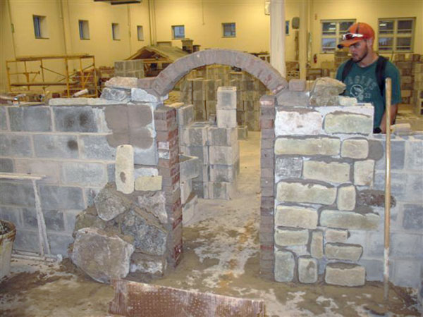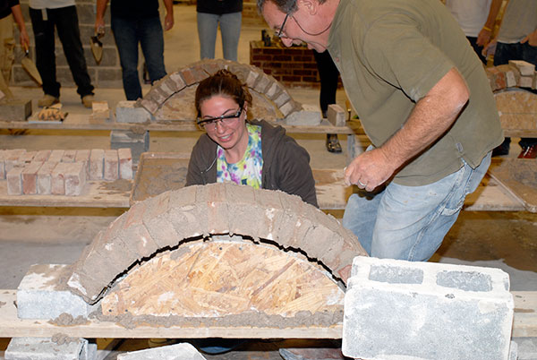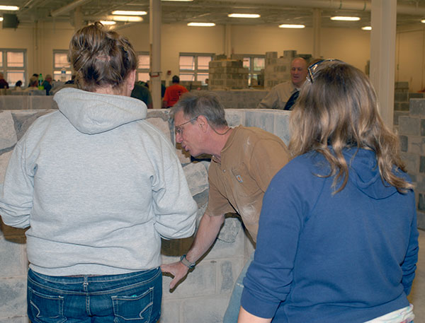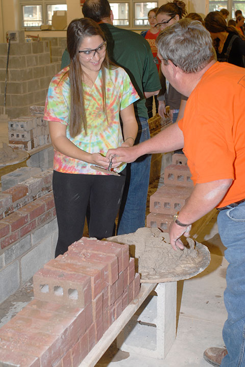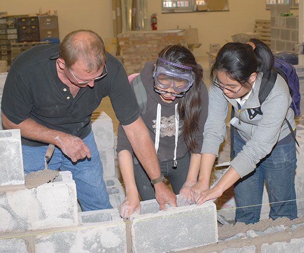 A record 63 landscape architecture students from The Pennsylvania State University filled Penn College's Construction Masonry Building on Tuesday afternoon, getting a concentrated dose of hands-on instruction. Faculty and students from the college's School of Construction and Design Technologies, joined by skilled industry representatives, mentored the guests as they moved through five stations: brick, block, cultured stone, real stone and archway construction. The day's agenda, which mirrors an annual spring excursion by Penn State architecture majors, culminated in an informal competition among teams of visiting students. Contributing to the tradition's success were Glenn Luse and Richard Motter, instructors of building construction; Robert Gresko, instructor of construction technology; Byron Singer, manager of Centre Hall Masonry Supply; Thomas Smith, apprentice coordinator for Bricklayers and Allied Craftworkers Union Local #5; Ron Bower, business agent for the union local; Fred Fischer, union steward; and Ray Worth, a union bricklayer who helped build the college's masonry laboratory.